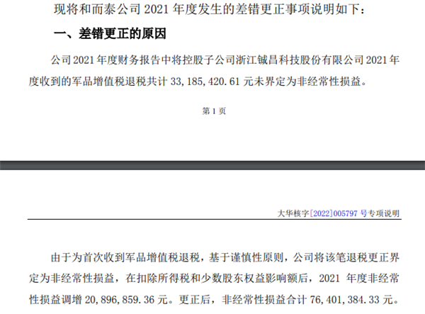 4月8日,和而泰发布公告称,2021年报中将控股子公司浙江铖昌科技股份有限公司2021年度收到的军品增值税退税共计3318.54万元认定为经常性损益。由于是首次收到军品增值税退税,基于谨慎性原则,公司将该笔退税认定为非经常性损益,因此需要对2021年度报告中披露的非经常性损益进行调整,公司2021年度非经常性损益调增2089.69万元。