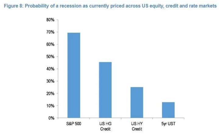根据他的估计,美国和欧洲股市的定价显示,美国经济在近期内陷入衰退的可能性为70%。Kolanovic周一(5月16日)在给客户的报告中写道,相比之下,投资级债券市场认为有50%的可能性,高收益债券认为有30%的可能性,利率市场则认为有20%的可能性。