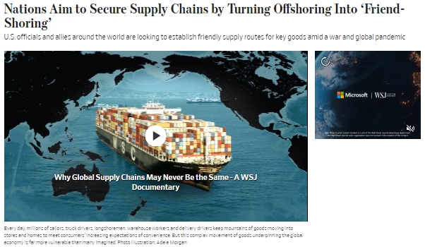 现在,美国官员和他们在欧洲、亚洲和太平洋地区的盟友正在推动和资助新的生产和贸易渠道,通过友好国家运送必需品。三星电子和Gap Inc.等企业正在利用这一趋势。这一趋势发生在新冠肺炎疫情、俄罗斯入侵乌克兰、美国和中国之间的贸易战等一系列中断之后。支持者认为,这是重整全球供应链,降低对中国、俄罗斯等国家与非市场经济体依赖的契机。