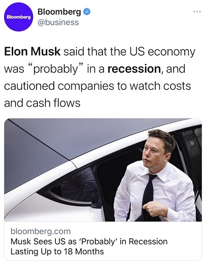 FX168财经报社(香港)讯 特斯拉(Tesla)和SpaceX的首席执行官埃隆·马斯克(Elon Musk)认为,美国可能已经处于经济衰退之中,衰退时期或长达18个月。他并警告公司要关注成本和现金流。马斯克有关经济衰退的观点和目前经济学家的主流观点和现有数据并不一致。