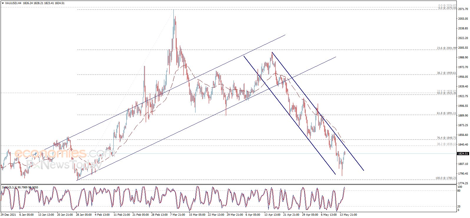 (现货黄金4小时图 来源:Economies.com)