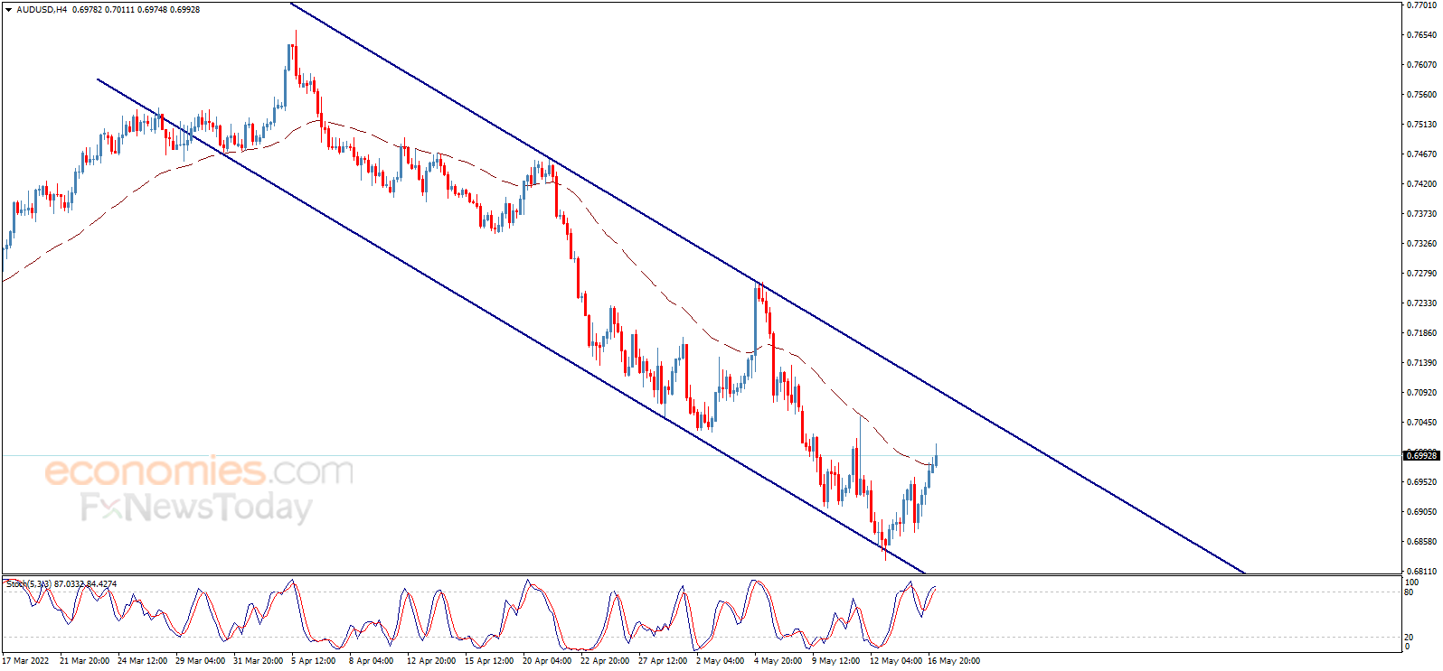 澳元/美元强势反弹并突破0.6950,日内有望进一步上涨,并测试看空通道阻力0.7095。