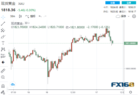 零售销售数据公布之后,现货黄金自高位加速下滑,并刷新日低至1818.17美元。