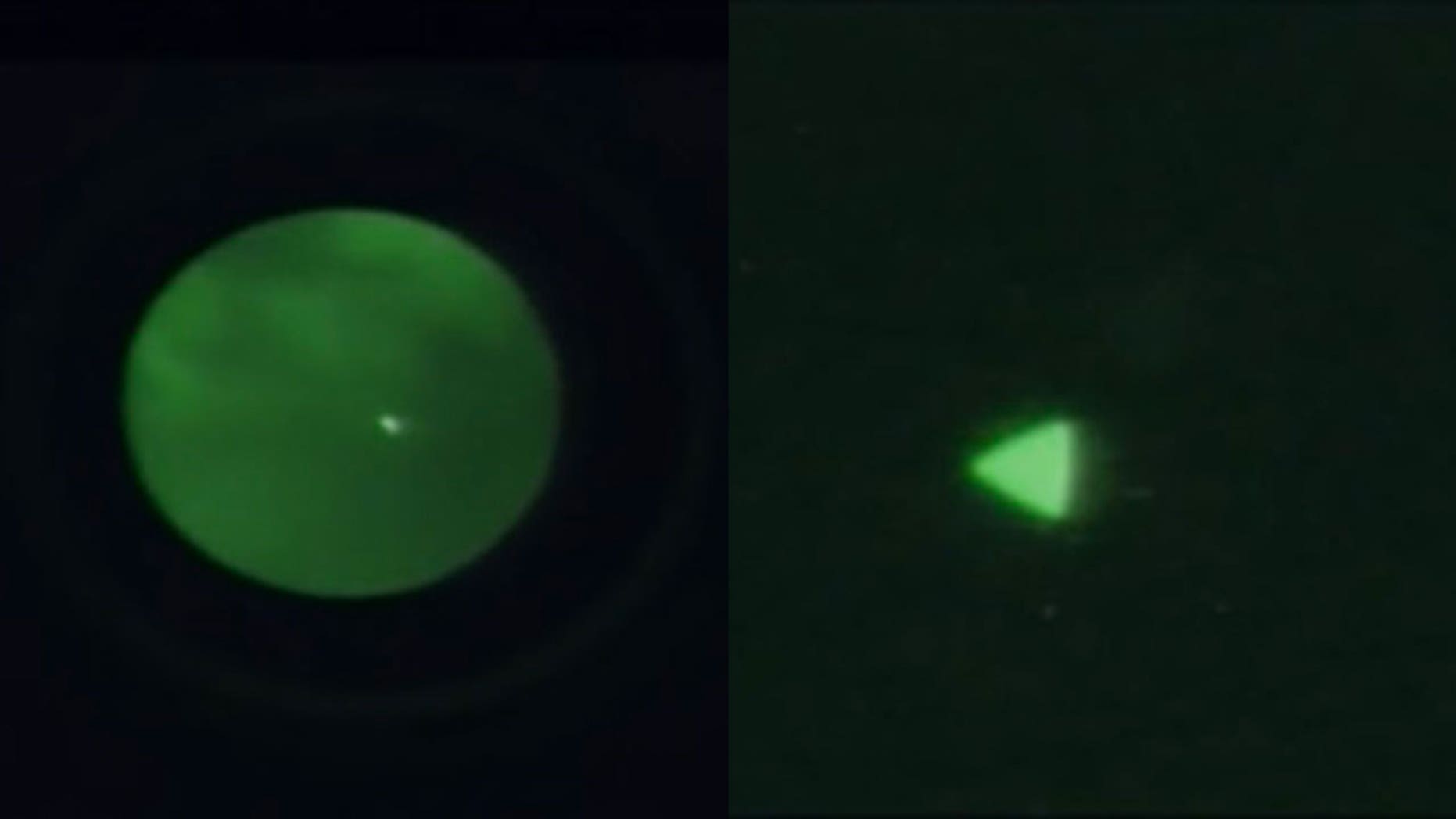 在一段简短而摇晃的视频中,一个小物体似乎从一名军方飞行员身边飞过。在另一段视频和另一张在不同时间拍摄的类似照片中,可以看到夜空中发光的三角形。
