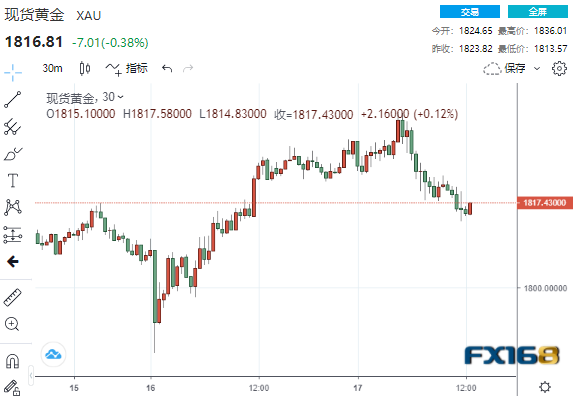 现货黄金自鲍威尔开始讲话以来累跌近7美元,并刷新日低至1813.57美元/盎司。