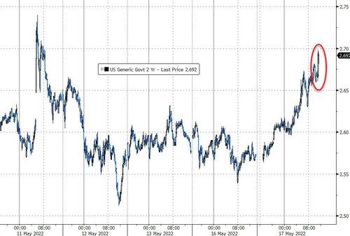 美国两年期国债收益率升至2.696%,10-2年期国债利差缩窄至26个基点。美国10年期国债收益率涨至日高,报2.984%。