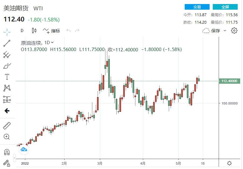 截至发稿,美国WTI原油期货下行0.36美元,跌幅0.32%,现报113.51美元/桶;布伦特原油期货下探1.36美元,跌幅1.19%,报112.52美元/桶。