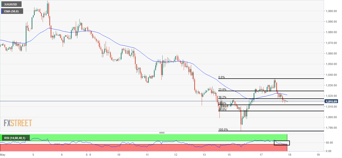 FXStreet提到黄金技术分析,按小时计算,黄金守在50%斐波那契回撤位1811.63美元上方,从周一低点1786.94美元到周二高点1836.15美元。贵金属已跌破50周期指数移动平均线(EMA)至1821.02美元。相对强弱指数(RSI)(14)在40.00水平获得支撑,这表明响应性购买参与者的可用性。