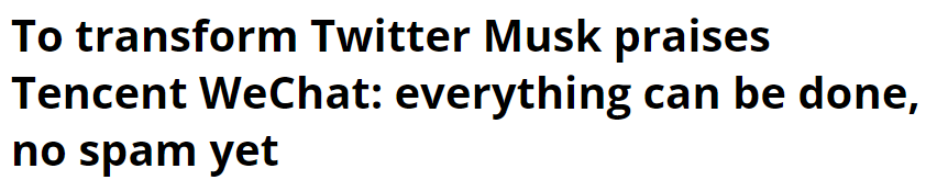 马斯克也坦言,微信这种模式不一定要由推特来完成,可以重新做一个新产品,但不管怎样必须有一个这样的APP存在才行。