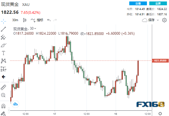 现货黄金在跌至1807.16美元低点后自低位反弹,并刷新日高至1824.22美元。