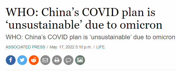 谭德塞在周二(5月17日)的新闻发布会上表示,中国的“清零”战略是“不可持续的”,上周他的类似言论遭到了中国的尖锐批评。