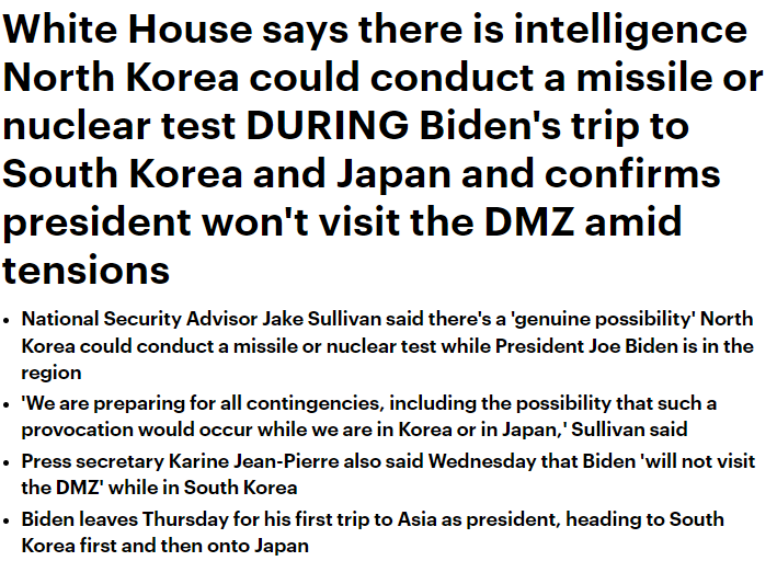 沙利文在周三的白宫例行新闻简报会上指出,美方情资确实显示,在拜登访问亚洲期间,北韩有试射可携核飞弹或测试核武的确切可能性。他说:“我们正为所有突发事件进行准备,包括我们在韩国或日本期间发生,朝鲜做出这类挑衅的可能性。”他补充,美国正与韩国和日本密切协调,他还与中国中共中央外事工作委员会办公室主任杨洁篪通电话讨论朝鲜问题。