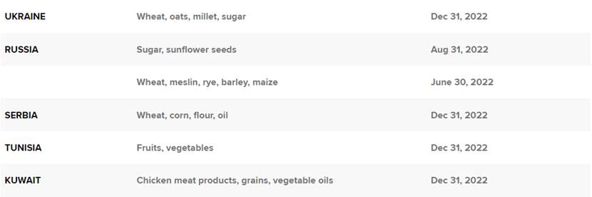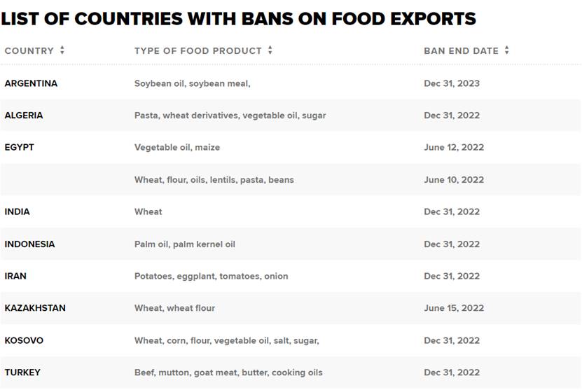 不仅仅是小麦。由于乌克兰危机导致全球通胀飙升,许多国家也实施了其他食品出口禁令。