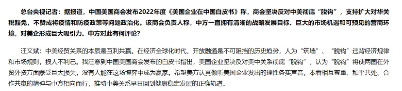 汪文斌称,他注意到中国美国商会发布的白皮书指出,美国企业坚决反对美中关系彻底“脱钩”,认为“脱钩”将使两国在外贸外资方面蒙受巨大损失,没有人能在这场博弈中成为赢家。希望美方认真倾听美国企业发出的理性务实声音,本着相互尊重、和平共处、合作共赢的精神与中方相向而行,推动中美关系早日回到健康稳定发展的正确轨道。