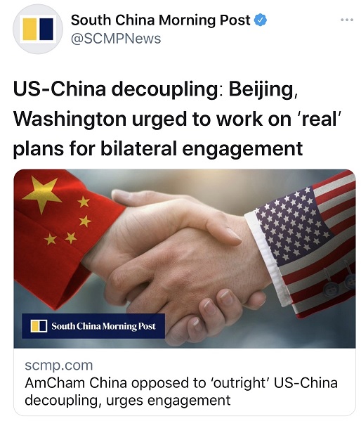 中国美国商会在其最新的白皮书中表示:“我们仍然反对任何试图使美中关系完全脱钩的行为。”