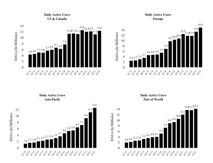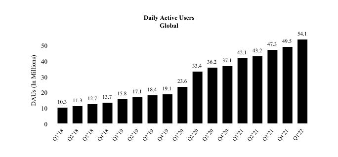根据财报电话会议,Roblox 2022Q1 DAU(日活跃用户数量)为5410万,同比增长28%,达到历史最高水平。公司就疫情前后对DAU增长的影响做了比对,疫情前的4个季度(19Q2 – 20Q1)用户年化复合增长率为46%;疫情期间(20Q2 – 21Q1),这个增长几乎翻了一倍,达到91%。疫情逐步恢复后的4个季度(21Q2 – 22Q1),复合增长率在30%左右。