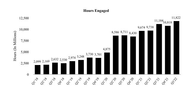 在用户使用时长方面,2022Q1用户使用时长为118亿小时,同比增长22%。流水情况与用户使用时长高度相关,但由于新冠疫情的影响,使用时长在部分群体中有所减少。比如疫情前,9-12岁年龄段人群有200 万DAU,每周投入时间500万小时不到。而在 COVID 期间,9 到 12 岁的同一队列中的 DAU 跃升至300万,每周投入1000 万小时。现在同样的300万DAU,但每周投入 800 万小时。