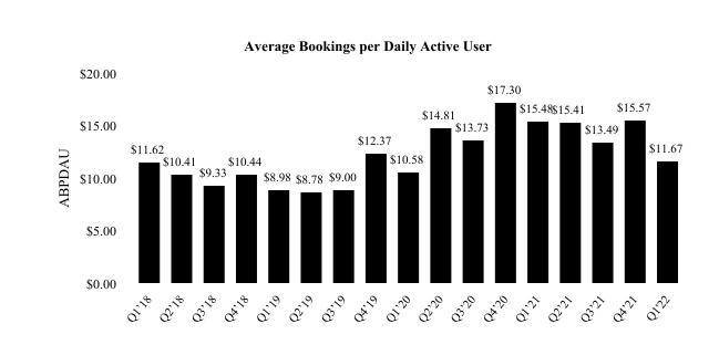 2022Q1,ABPDAU(单日活用户平均预定量)11.67 美元,同比下降25%。
