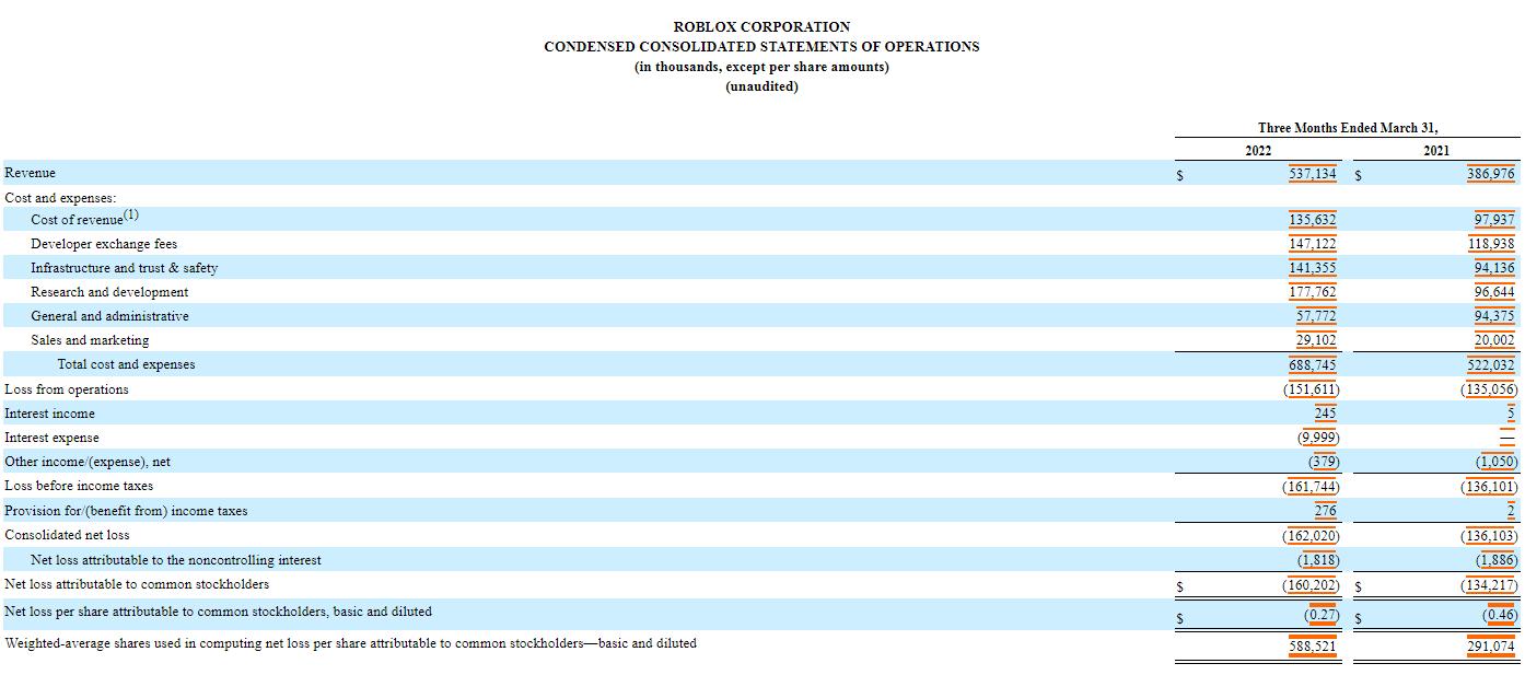 根据财报数据显示,Roblox 2022 年第一季度收入为5.371 亿美元,同比增长39%;净亏损1.6 亿美元,相比2021Q1 的1.342 亿美元亏损,亏损同比扩大18.8%;归属股东每股摊薄后亏损0.27 美元,相比21 年同期亏损(0.46 美元)收窄。