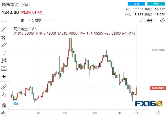 COMEX 6月黄金期货收涨25.30美元或1.4%,报1841.20美元/盎司,创下4月12日以来最活跃黄金期货的最大单日百分比涨幅。