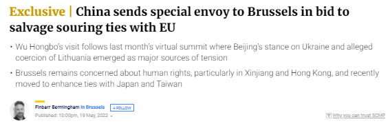 FX168财经报社(北美)讯 据南华早报周四(5月19日)报道,中国下周将派遣一名高级特使前往布鲁塞尔,希望加强与欧盟陷入困境的关系。