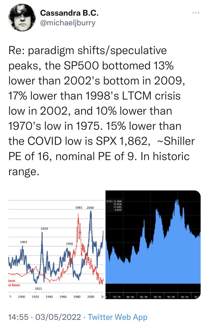 标准普尔500指数从2020年春季的疫情暴跌中强势反弹,从2192点的低点回升至4089点。伯里在5月3日的推文里指出,然而,在接下来的几年里,它可能会暴跌54%至1862点。