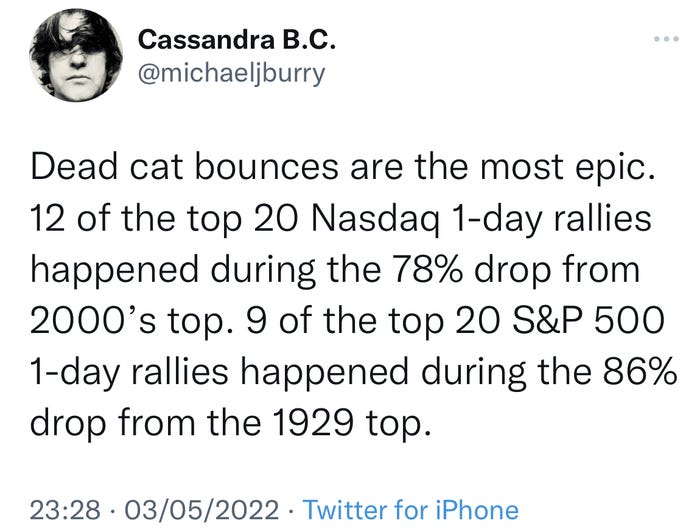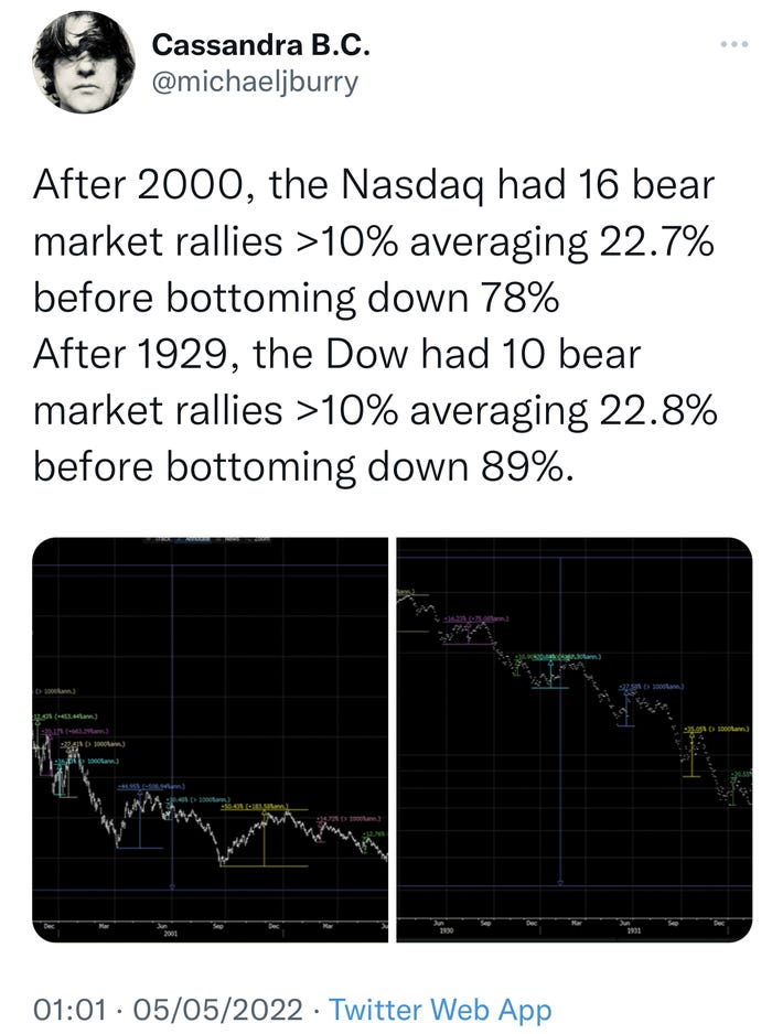 伯里在5月4日的推特上说,这种情况经常发生在股市大幅下跌的时候。这意味着,投资者不应对未来几个月的反弹抱有太大希望,因为这些反弹很可能只是短暂的喘息,不会导致市场复苏。
