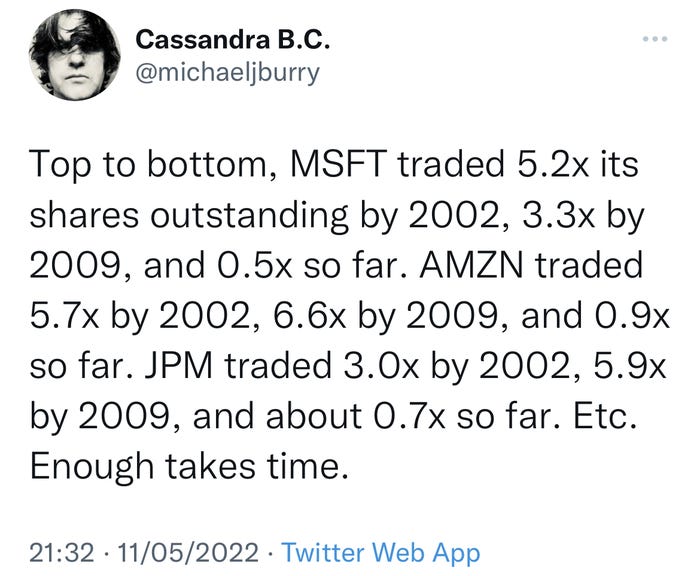 伯里指出,亚马逊和摩根大通的情况也类似,暗示这两家公司的股票和其他公司的股票可能需要一段时间才能见底。