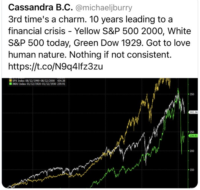这位Scion首席执行官指出,标准普尔500指数过去10年的走势与互联网泡沫破灭前10年的指数走势以及1929年大崩盘前10年的道琼斯指数走势惊人地相似。