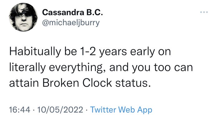 这位Scion的老板开玩笑说,他的预测太早了,就像他在2005年前后美国房地产泡沫时那样。