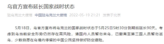 FX168财经报社(香港)讯 据中国驻乌克兰大使馆5月19日消息,5月18日,乌官方宣布将乌克兰的国家战时状态于5月25日5时30分到期后延长90天。考虑到乌当前安全形势仍然存在高风险,请国内人员暂勿来乌,已撤离至第三国人员暂勿返乌,少数自愿在乌境内停留的中国公民坚持做好防空避险。