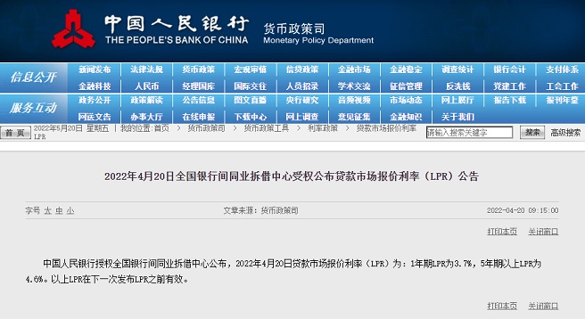中国人民银行授权全国银行间同业拆借中心公布,2022年5月20日贷款市场报价利率(LPR)为:1年期贷款市场报价利率(LPR)为3.7%,与上月持平,预期为3.65%;5年期LPR为4.45%,较上月的4.6%大幅下调15个基点。