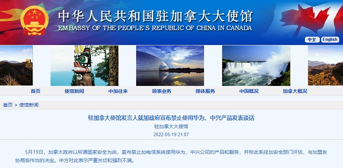 5月19日,中国驻加拿大使馆发言人就加政府宣布禁止使用华为、中兴产品发表谈话。发言人表示,中方对此表示严重关切和强烈不满。