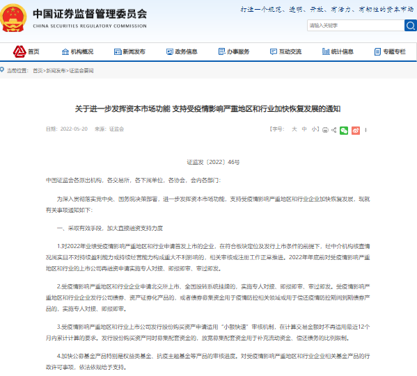 据悉,《通知》主要针对受疫情影响严重地区和行业,包括上海、吉林等全面实行封控管理、静态管理等措施的区域,以及餐饮、零售、旅游、民航、公路水路铁路运输等受疫情影响严重的行业。后续,证监会还将根据情况变化进行动态调整。