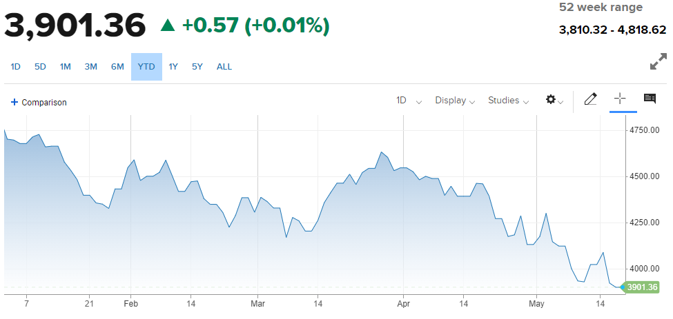 标准普尔500指数周五收盘上涨0.01%,至3901.36点,盘中一度下跌2.3%。截至当日低点,标准普尔500指数较1月份盘中高点低20.9%。该指数收盘时较历史高点低约19%。