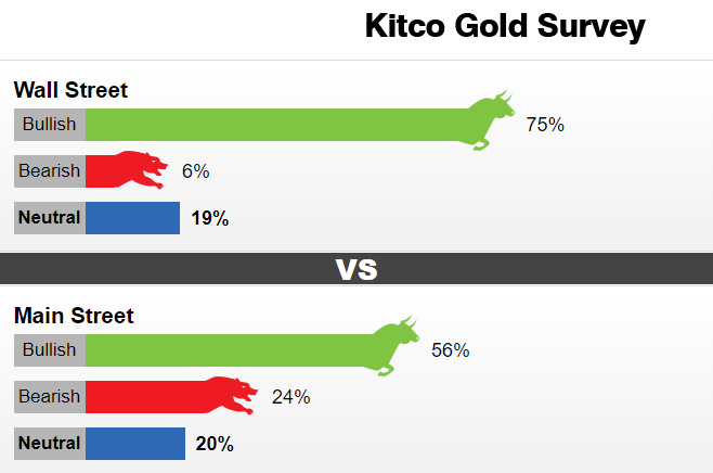 本周,16位华尔街分析师参加了Kitco的黄金调查。在参与者中,有12位分析师(75%)预计金价下周将上涨。与此同时,1位分析师(6%)对近期金价持悲观看法,3位分析师(19%)对金价持中性看法。