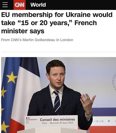 FX168财经报社(香港)讯 当地时间5月22日,法国欧洲事务部长克莱芒·博纳(Clement Beaune)表示,乌克兰加入欧盟的过程可能需要15年或20年的时间。这让乌克兰总统泽连斯基希望在6个月内加入欧盟的希望落空。