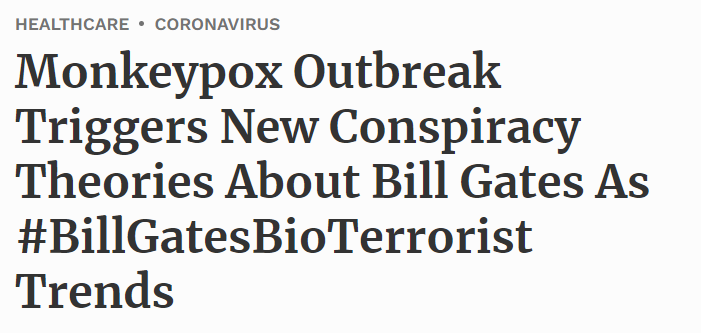 也有人指控,此次的猴痘疫情主要是比尔·盖茨正在释放病原体进行人体实验。目前推特上已经出现#BillGatesBioTerrorist(比尔·盖茨生化恐怖份子)的标签,该标签甚至一度成为推特的热门议题。