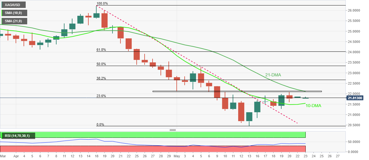 Panchal写道,随着银价在周一亚市交易时段反弹,相对强弱指数(RSI)逐渐走高,这令白银多头充满希望。值得注意的是,攻克21日移动均线和包含5月初以来多个高点的水平区域的汇合处(约22.10-15美元/盎司),对白银多头来说似乎是个难题。