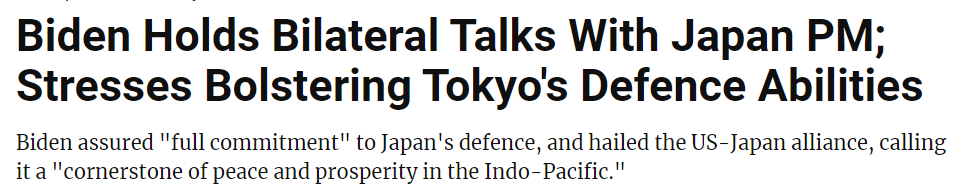 拜登提到,美日同盟长期来已成印度太平洋地区和平与繁荣基础,美国对有助日本防卫之事绝无动摇,重申华府对日本防卫的承诺。