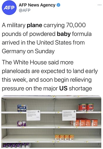白宫表示,这架货运飞机从德国拉姆施泰因的美国空军基地起飞,机上载有超过7万磅的配方奶粉。