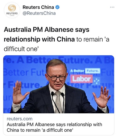 香港《南华早报》5月22日分析称,总体而言,澳大利亚新政府预计将继续对中国采取强硬立场,工党在竞选期间也表示,在南海和台湾等问题上不会有重大变化。阿尔巴内塞还说过,他外交政策的“第一个支柱”将是与美国的联盟。