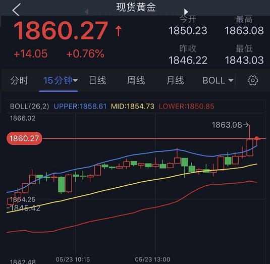 美元走软推动金价进一步上涨,现货黄金目前最高触及1863.08美元/盎司。