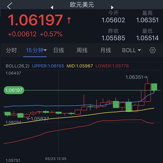 受拉加德讲话提振,欧元/美元短线大涨,目前最高触及1.0635;美元指数则显著下滑,最低一度触及102.42。