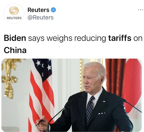 FX168财经报社(香港)讯 周一(5月23日),美国总统拜登(Joe Biden)表示,他正考虑降低对中国商品的关税。拜登强调说,这些关税壁垒不是他的政府设置的。
