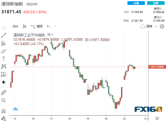 标普500指数涨幅一度达2%,纳斯达克综合指数上涨1.69%,道指涨超700点或2.25%。