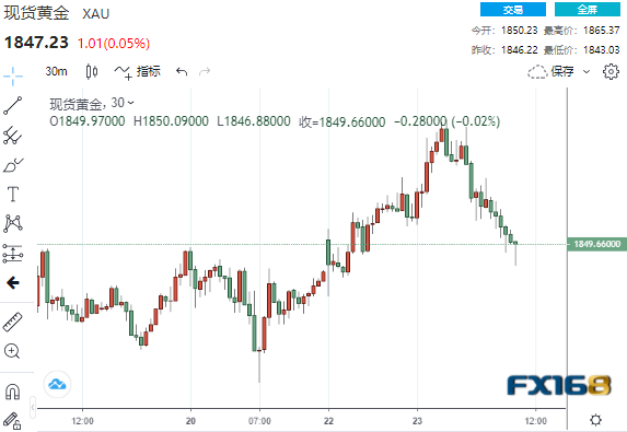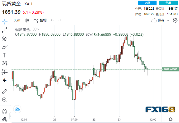 美市盘中,现货黄金一度自高位回落约19美元至1846美元一线,几乎回吐了日内所有涨幅。