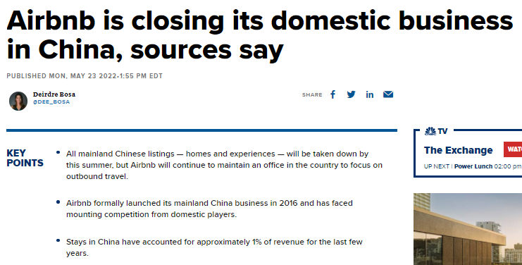 FX168财经报社(北美)讯 周一(5月23日),据两位知情人士透露,爱彼迎(Airbnb)将关闭其在中国的国内业务。该公司计划最早于周二上午告诉中国国内的员工。
