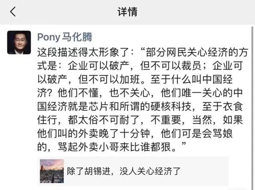 马化腾对这篇文章的唯一评论突显了文章作者所说的一句话,他说年轻的社交媒体用户反资本主义,信奉双重标准。