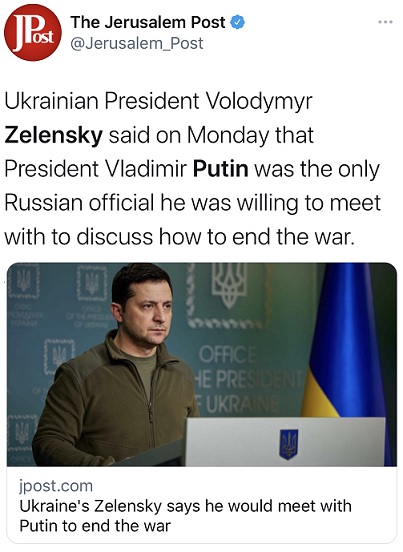 泽连斯基说道:“除了总统(普京)以外,我无法接受和任何来自俄罗斯的人会面,而且要是在谈判桌上只有‘停止战争’这议题的状况下会面,没有其他理由进行任何其他形式的会议。”